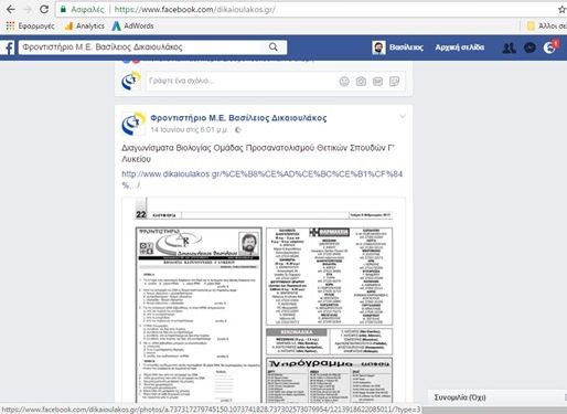 Στις 23 Φεβρουαρίου 2017 το Φροντιστήριο «Δικαιουλάκος Βασίλειος» δημοσίευσε στην εφημερίδα «Ελευθερία»: